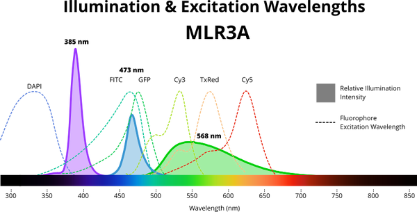 Figure 1: Illumination wavelengths of MLR3A compared to excitation spectra of common fluorophores