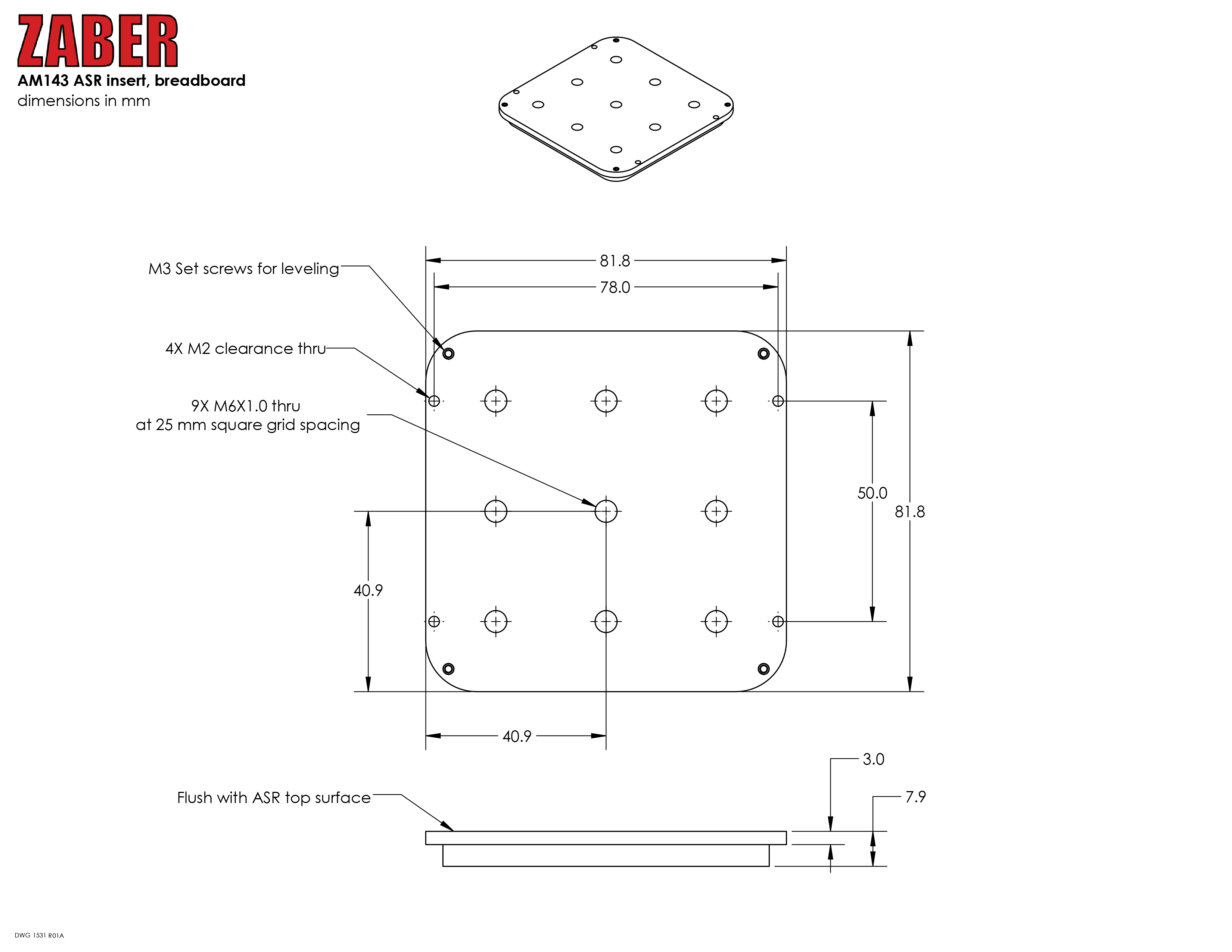 This 82 x 82 mm insert fits into the top plate of ASR 50 x 50 mm travel XY stages. It is held in place by a spring clip on the stage as well as 4 optional M2 screws (included). The AM143 features a grid of M6 tapped holes on 25 mm spacing to allow for easy mounting of other Zaber devices or accessories.