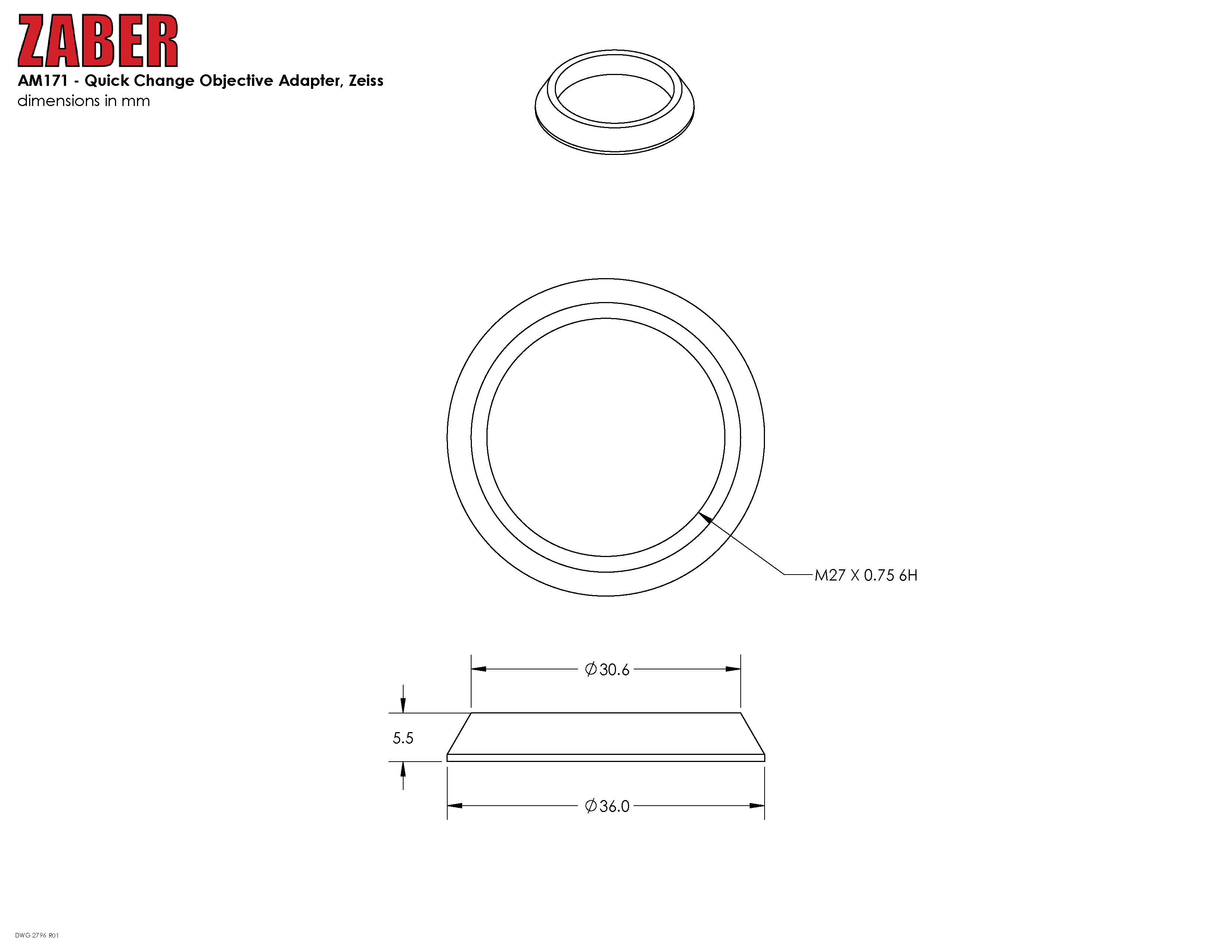 These adaptors are designed to be used with Zaber microscopes to mount Zeiss (M27 x 0.75) objectives.