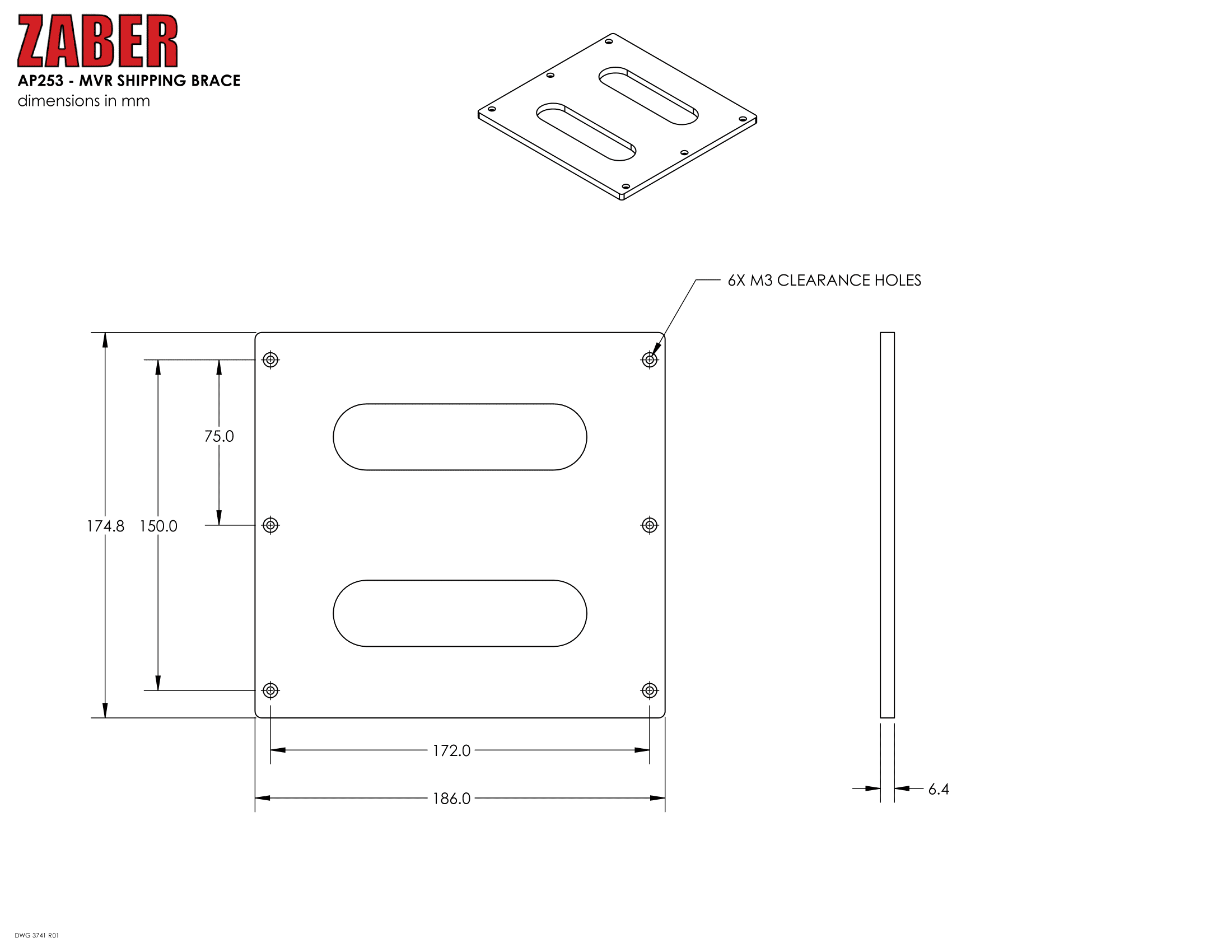 This shipping accessory is designed for Zaber’s ADR product series. The accessory has M4 clearance holes for mounting to the ADR base and M6 clearance holes for mounting to the ADR top. Fasteners are included.