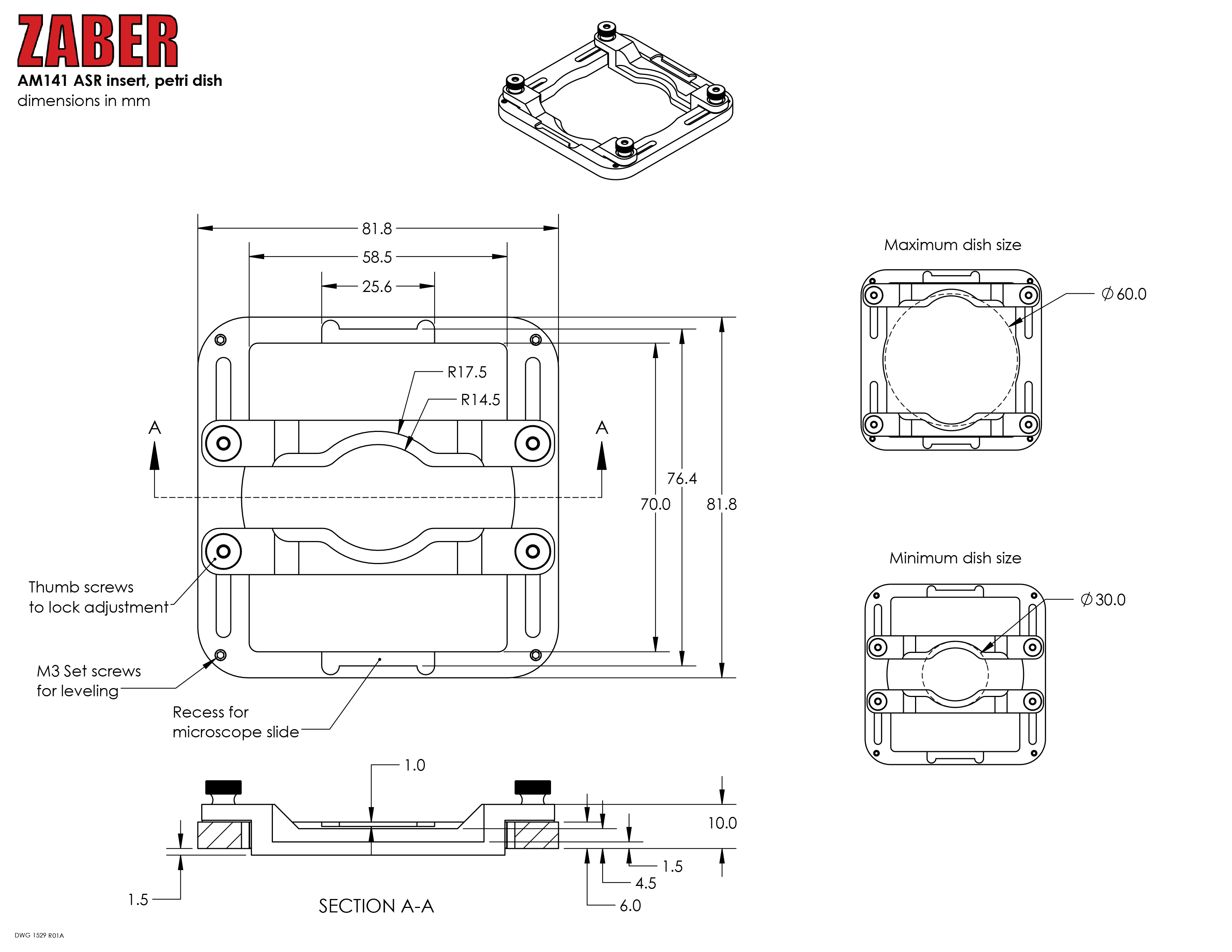 This 82 x 82 mm insert fits into the top plate of ASR 50 x 50 mm travel XY stages. It is held in place by a spring clip on the stage allowing quick changes between different inserts. The AM141 adjusts to hold different sized petri dishes from 30-60 mm in diameter.